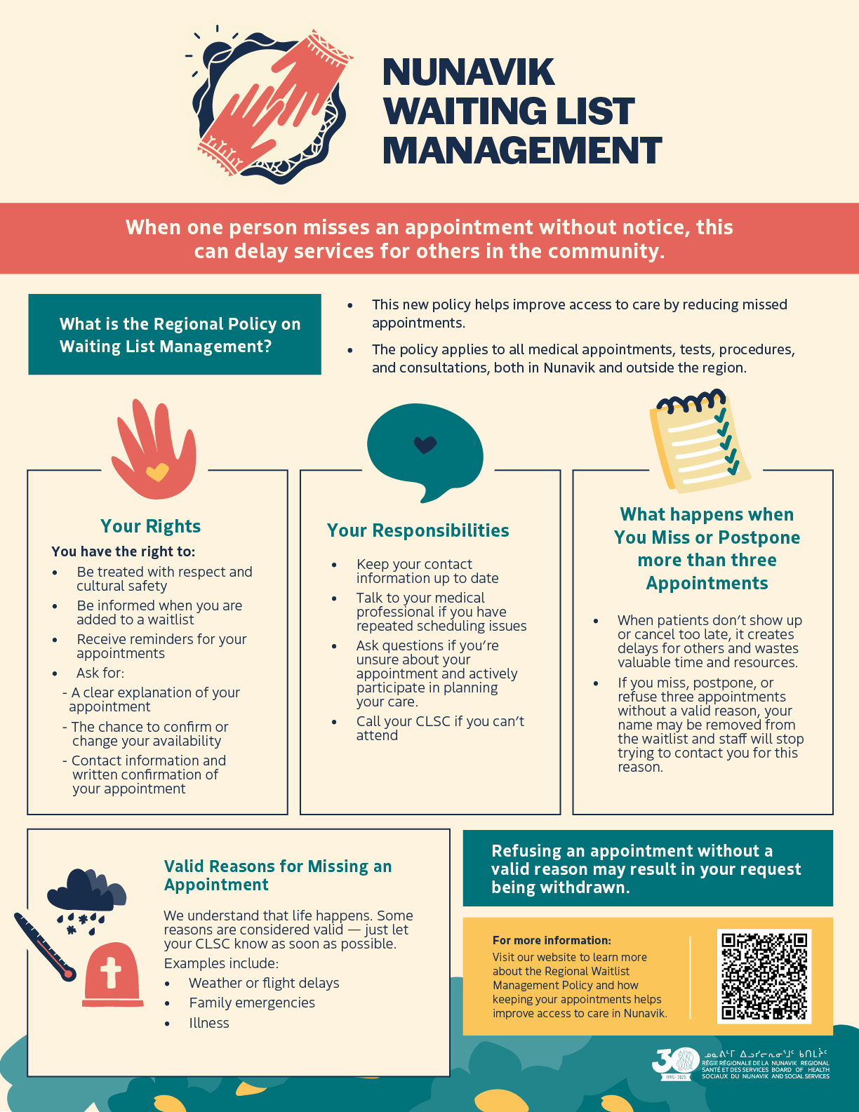 - This Policy helps ensure better access to health services in Nunavik by reducing missed appointments. When patients don’t show up or cancel too late, it creates delays for others and wastes valuable time and resources.