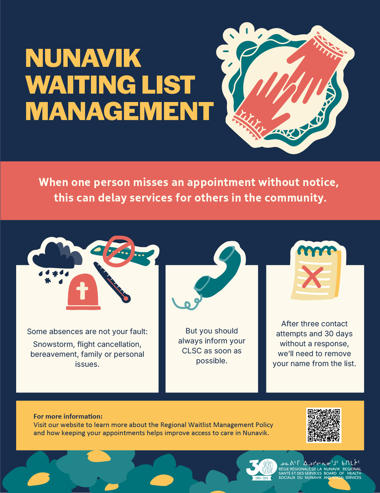 - Read the full regional policy on active management of waiting lists to improve access to services for Nunavik residents (PDF)