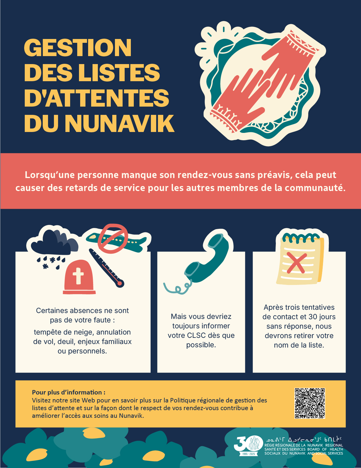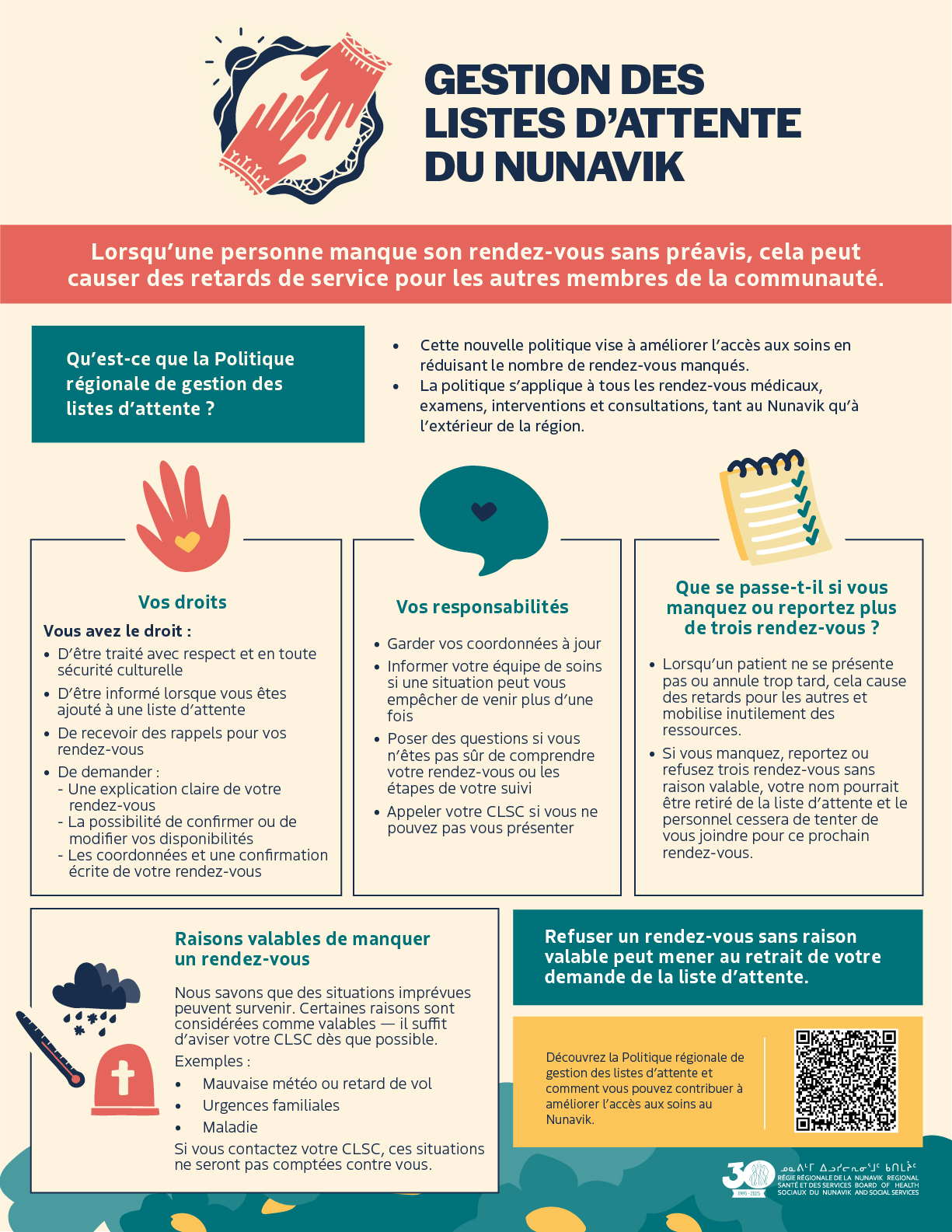 • Cette politique s’applique à tous les rendez-vous médicaux, examens, interventions et consultations, au Nunavik et à l’extérieur de la région.